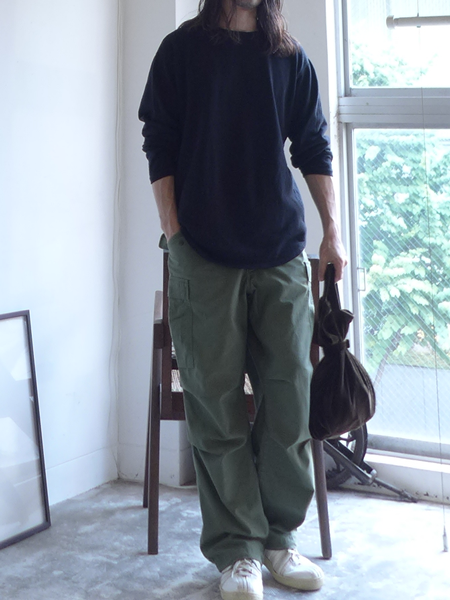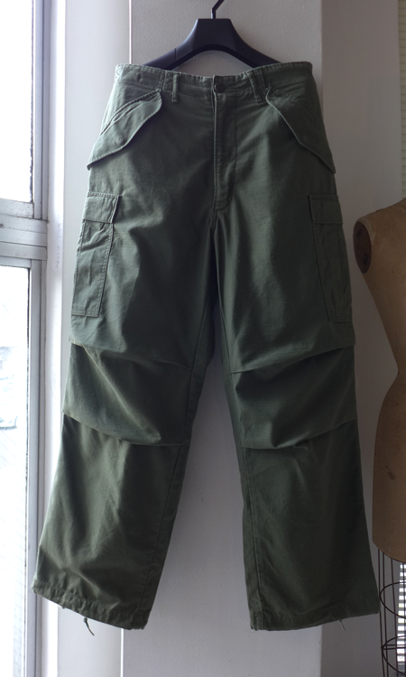 1970年代頃のU.S.ARMY M-65フィールドパンツです。6ポケットパンツ、ニータックパンツなど現代カーゴパンツの基礎となっています。今回のは71年製。混紡素材ならではのドライな質感、毛玉感など、個人的に好きなところです。良い意味で雑に履けて、綺麗目のトップスとも相性が良いので、非常に出番の多いアイテムです。