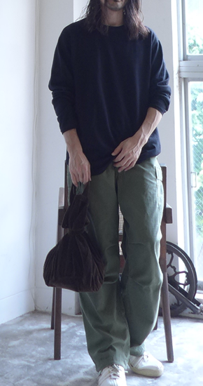 普段国内ブランド物でLサイズを着用しています。普段ヴィンテージのデニムパンツなどでW33を着用しておりますが、こちらのパンツに関してもちょうど良い感じで履けます。