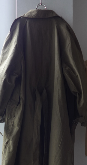 オーバーコートですが、日本人体型に非常によく合っており、少しオーバーサイズで肩を落として着るには完璧なアイテムだと思います。綺麗なラグランスリーブは、袖をぎゅっと絞って着ると一気にモードになりますね。ウエストベルトも無造作に絞ってください。ミリタリーを超えて最早エレガントです。