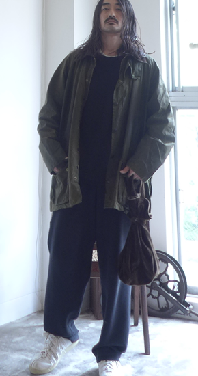 サイズは50。このサイズは中々出てこないですね。そもそも大きいジャケットではないので、ヴィンテージバブアーらしく土臭く着るなら、今回のサイズは中々いいと思います。普通のジャケットのXLくらいなので、着れる人も多いと思います。柔らかいオイルドクロスならではの肩の落ちがいい感じです。
